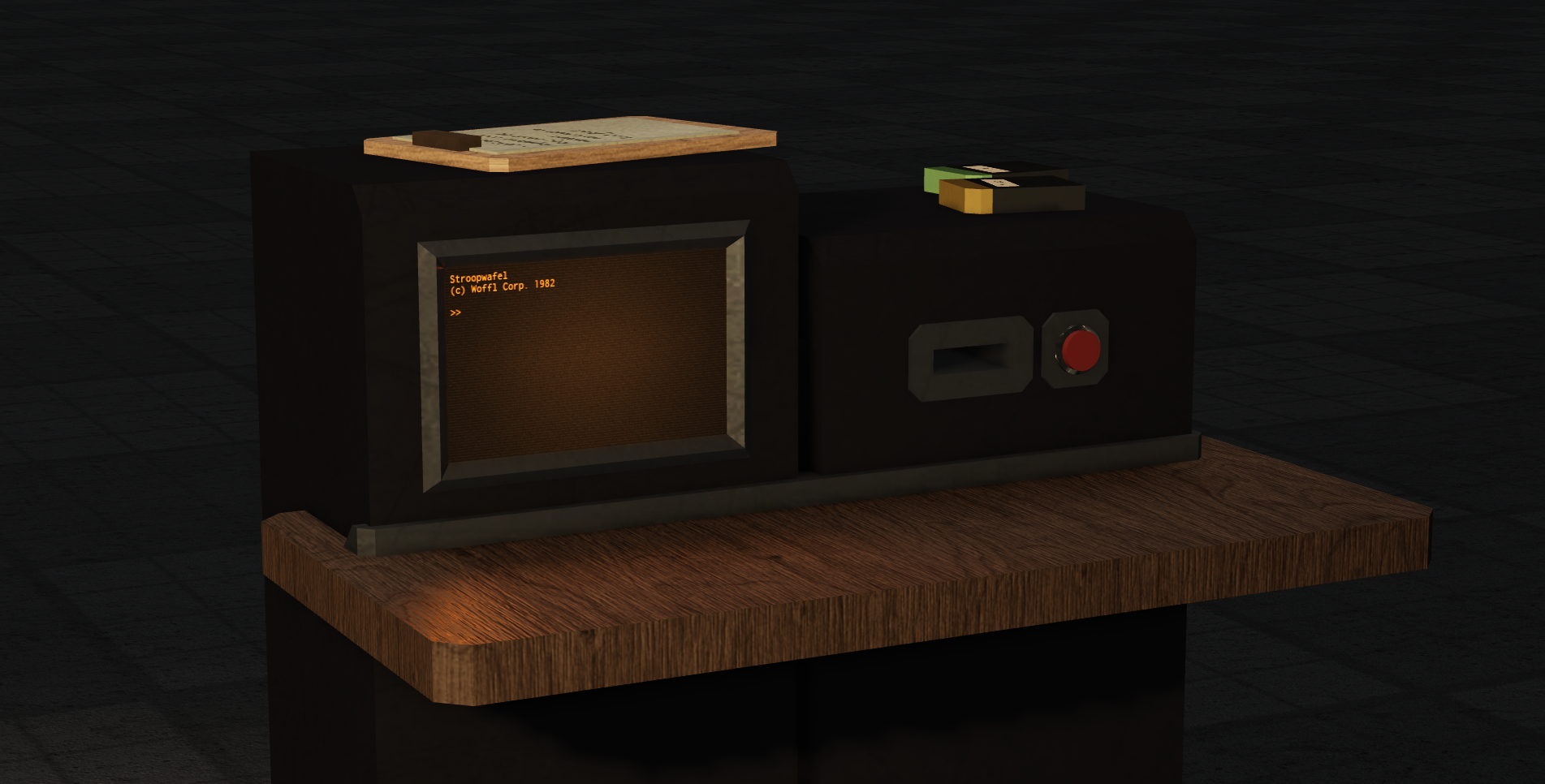 Presenting Stroopwafel, a chunky experimental 1980s terminal to perform very simple tasks. Includes a nice little API to interact with core machine functionality (displaying text, playing audio, interacting with cartridges and so on) and an expandable system for commands, where each command is just a modulescript which defines its name, format, description, and function to execute. These 2 systems combined make it really simple to add new functionality.